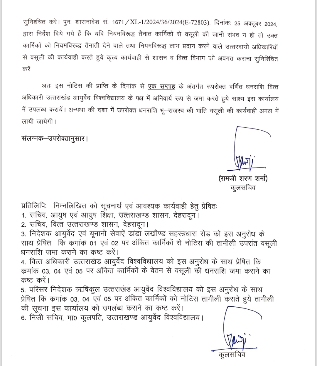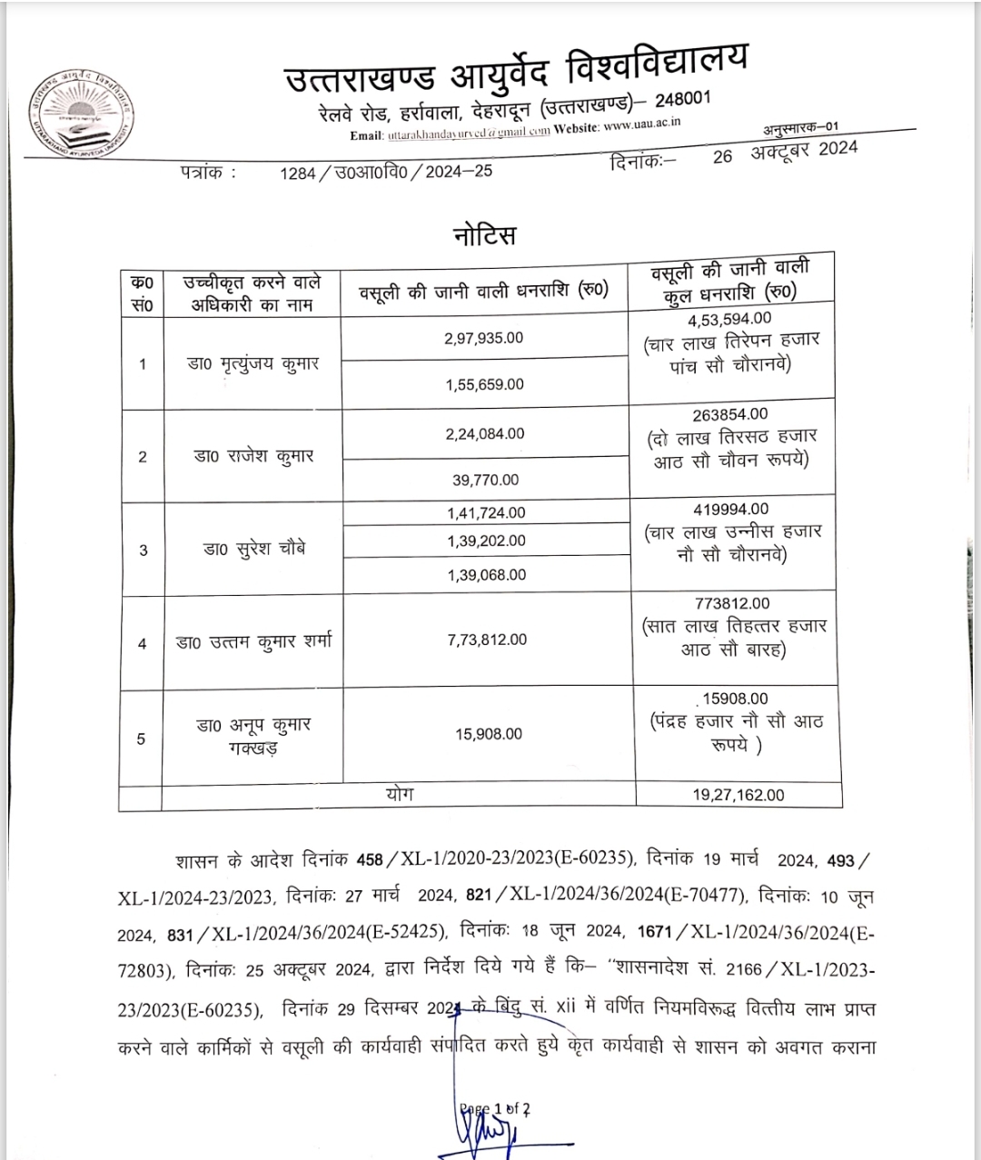 देहरादून। उत्तराखंड आयुर्वेद विश्वविद्यालय में साल 2015 से 2023 तक 50 से ज्यादा कर्मचारियों के नियम विरुद्ध प्रमोशन के मामले में पांच कुलसचिवों से 19.27 लाख रुपये की वसूली की जाएगी।