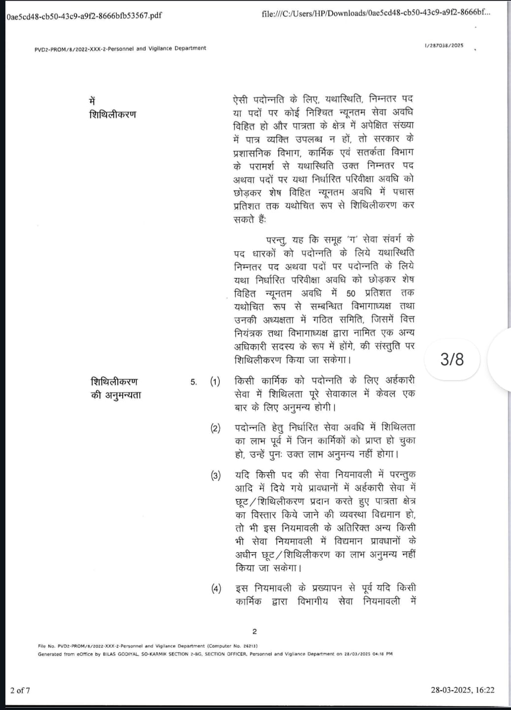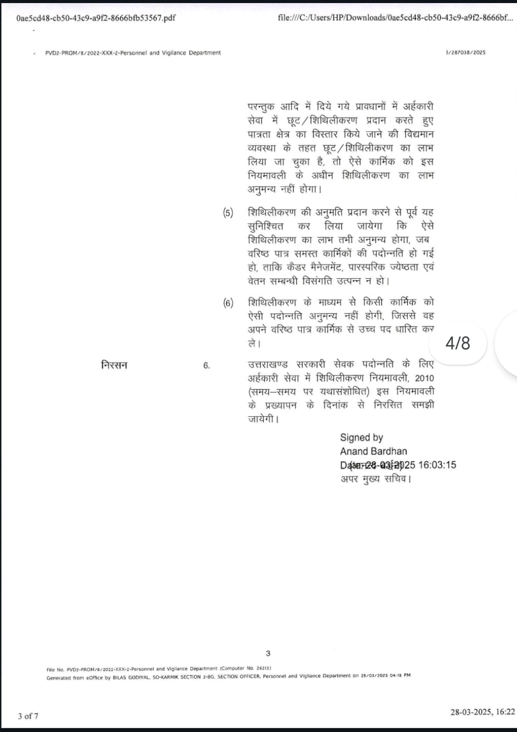 देहरादून। राज्य कर्मचारी संयुक्त परिषद उत्तराखंड द्वारा राज्य कार्मिकों को पदोन्नति में शिथिलीकरण का लाभ दिए जाने की नई नियमावली का शासनादेश जारी किए जाने पर राज्य सरकार एवं शासन के शीर्ष अधिकारियों का हार्दिक आभार व्यक्त किया गया है । विदित है कि विगत 3 मार्च को हुई राज्य कैबिनेट की बैठक में राज्य कर्मचारी संयुक्त परिषद की इस अतिमहत्वपूर्ण मांग – राज्य कार्मिकों को पदोन्नति में शिथिलीकरण के प्रस्ताव को मंजूरी मिल गई थी