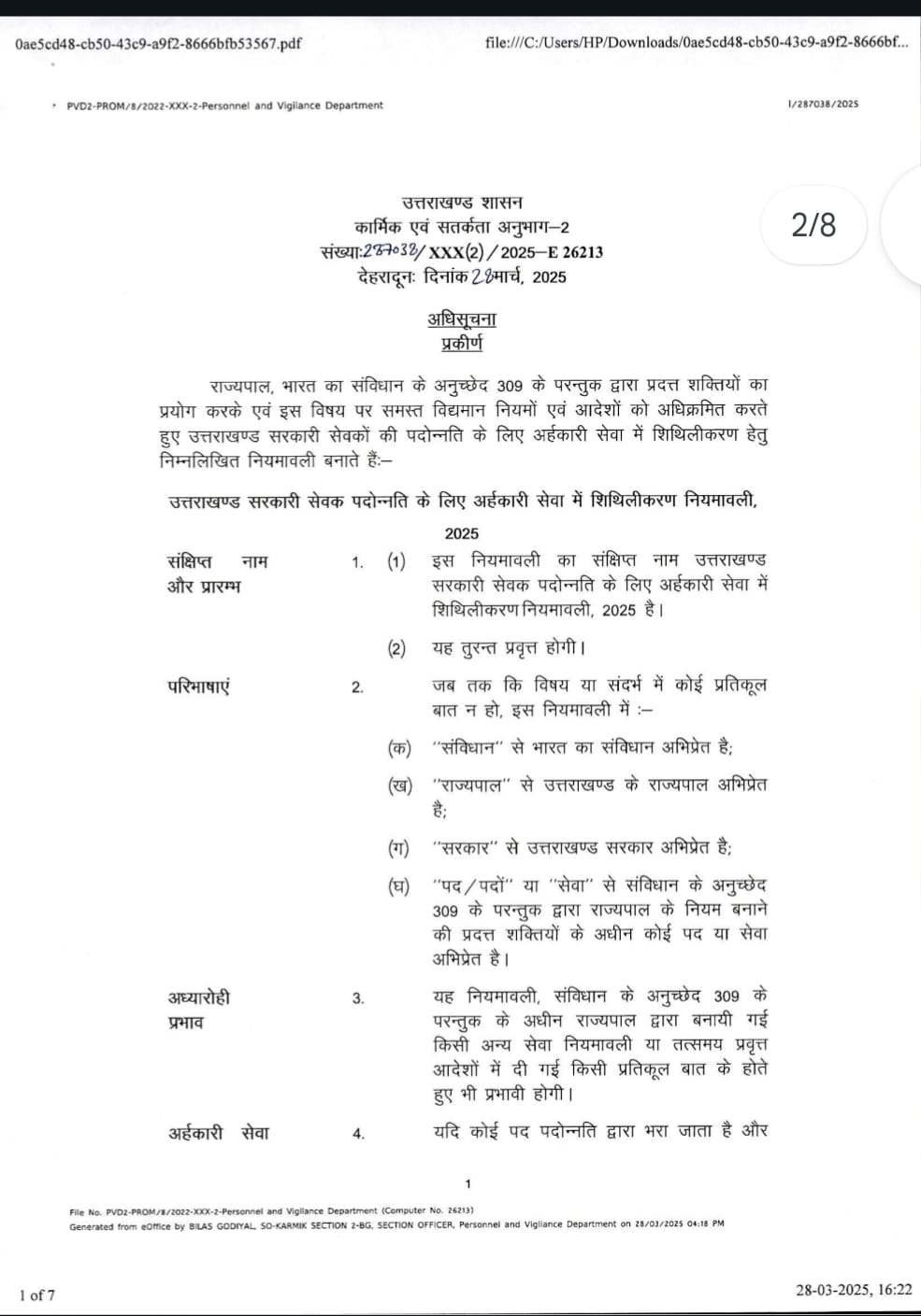 देहरादून। राज्य कर्मचारी संयुक्त परिषद उत्तराखंड द्वारा राज्य कार्मिकों को पदोन्नति में शिथिलीकरण का लाभ दिए जाने की नई नियमावली का शासनादेश जारी किए जाने पर राज्य सरकार एवं शासन के शीर्ष अधिकारियों का हार्दिक आभार व्यक्त किया गया है । विदित है कि विगत 3 मार्च को हुई राज्य कैबिनेट की बैठक में राज्य कर्मचारी संयुक्त परिषद की इस अतिमहत्वपूर्ण मांग – राज्य कार्मिकों को पदोन्नति में शिथिलीकरण के प्रस्ताव को मंजूरी मिल गई थी