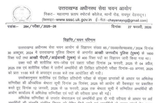 देहरादून। उत्तराखण्ड अधीनस्थ सेवा चयन आयोग ने पुलिस विभाग में कांस्टेबल जनपदीय पुलिस (पुरुष) के 1600 और कांस्टेबल पीएसी/आईआरबी (पुरुष) के 400 पदों की भर्ती परीक्षा का रिजल्ट घोषित कर दिया है। इन पदों के लिए 24 फरवरी, 2025 से 04 अप्रैल, 2025 तक शारीरिक माप जोख एवं दक्षता परीक्षा और शारीरिक परीक्षा में उत्तीर्ण अभ्यर्थियों की 03 अगस्त, 2025 को लिखित प्रतियोगी परीक्षा आयोजित की गई थी। शारीरिक एवं लिखित प्रतियोगी परीक्षा के संयुक्त प्राप्तांकों के आधार पर 29 दिसंबर, 2025 को अभिलेख जांच के लिए औपबंधिक श्रेष्ठता सूची जारी की गई। 12 जनवरी, 2026 से 18 फरवरी, 2025 [more…]