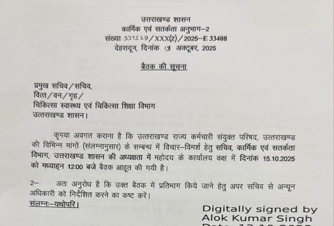 देहरादून। राज्य कर्मचारियों के विभिन्न लंबित प्रकरणों का लेकर सचिव (कार्मिक) शैलेश बगौली की अध्यक्षता में 15 अक्टूबर 2025 को सचिवालय में विभिन्न विभागों के प्रमुखों की राज्य कर्मचारी संयुक्त परिषद के पदाधिकारियों के साथ में महत्वपूर्ण बैठक बुलाई गई है। राज्य कर्मचारी संयुक्त परिषद के प्रदेश प्रवक्ता आरपी जोशी ने प्रेस विज्ञप्ति जारी कर बताया कि बताया कि राज्य कर्मचारी सयुंक्त परिषद कर्मचारी हितों से जुड़े प्रकरणों को लगातार शासन एवं सरकार के समक्ष रखकर उन्हें हल कराने का प्रयास कर रही है। इसी कड़ी में राज्य कार्मिकों को दीपावली बोनस एवं केंद्र सरकार बढ़ोतरी की गई दरों पर [more…]