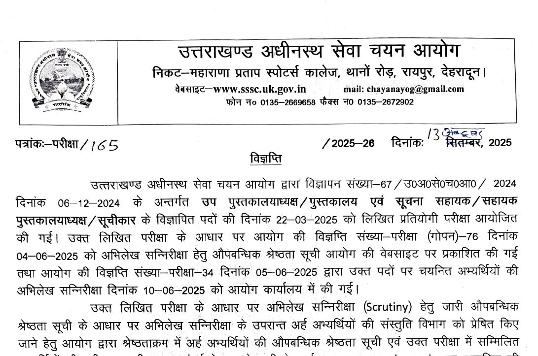 देहरादून। उत्तराखंड अधीनस्थ सेवा चयन आयोग ने उप पुस्तकालयाध्यक्ष/पुस्तकालय एवं सूचना सहायक/ सहायक पुस्तकालयाध्यक्ष/सूचीकार भर्ती परीक्षा का रिजल्ट घोषित कर दिया है।