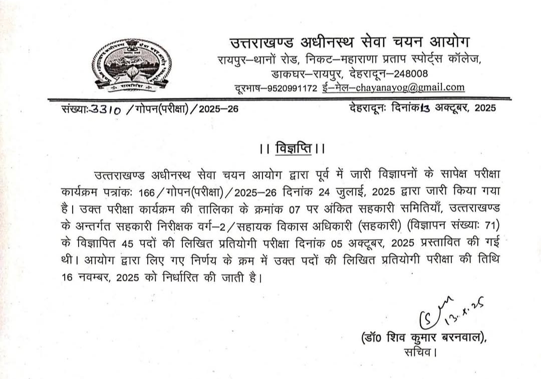 देहरादून। उत्तराखण्ड अधीनस्थ सेवा चयन आयोग ने सहकारी समितियां उत्तराखण्ड के अन्तर्गत सहकारी निरीक्षक वर्ग-2/सहायक विकास अधिकारी (सहकारी) के 45 पदों पर भर्ती के लिए लिखित परीक्षा की नई तिथि जारी कर दी है। अब यह परीक्षा 16 नवम्बर, 2025 को होगी। पूर्व में यह परीक्षा 05 अक्टूबर, 2025 को प्रस्तावित की गई थी।
