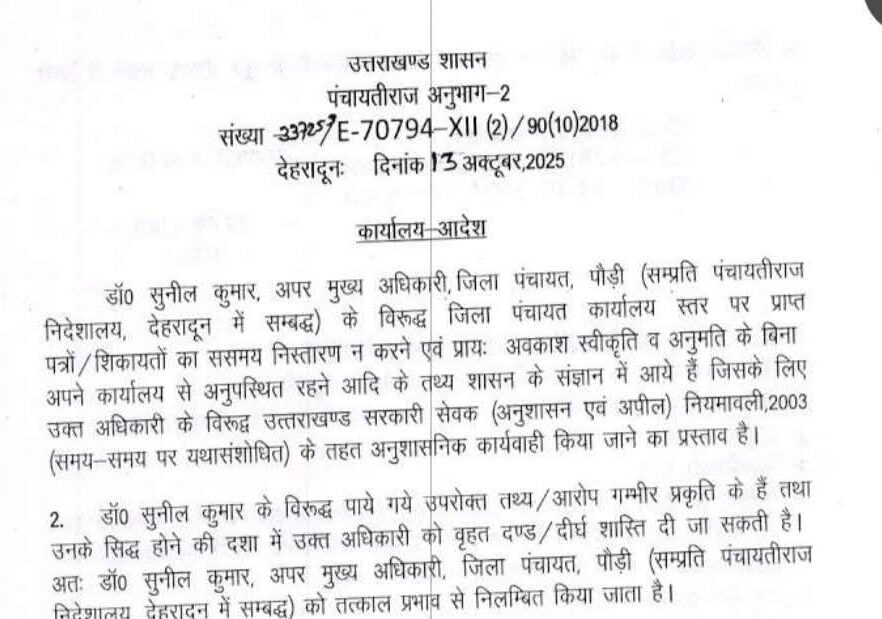 देहरादून। जिला पंचायत पौड़ी के अपर मुख्य अधिकारी डॉ० सुनील कुमार को जिला पंचायत कार्यालय स्तर पर प्राप्त पत्रों/शिकायतों का समय से निस्तारण नही करने और प्रायः अवकाश स्वीकृति व अनुमति के बिना अपने कार्यालय से अनुपस्थित रहने आदि के आरोप में शासन ने निलम्बित कर दिया है। निलम्बन अवधि में डॉ० सुनील कुमार पंचायतीराज निदेशालय, देहरादून में सम्बद्ध रहेंगे।