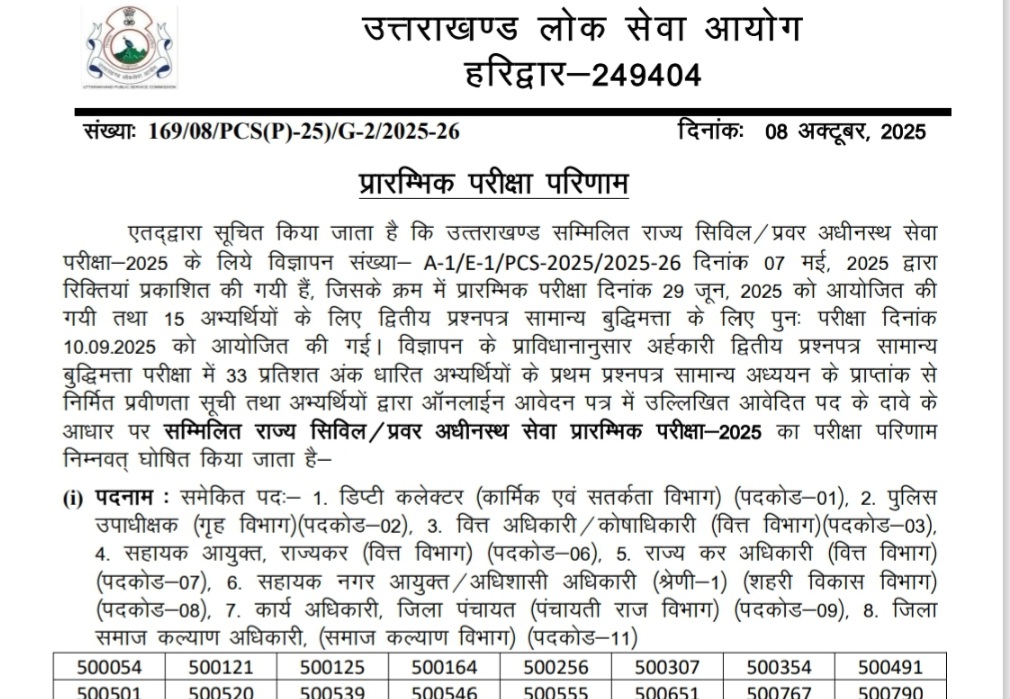 उत्तराखंड PCS प्री का रिजल्ट घोषित
