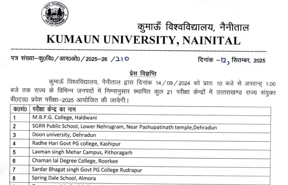 नैनीताल। कुमाऊं विश्वविद्यालय नैनीताल द्वारा 14 सितम्बर 2024 को प्रातः 10 बजे से अपरान्ह 1.00 बजे तक राज्य के विभिन्न जनपदों में 21 परीक्षा केन्द्रों में उत्तराखण्ड राज्य संयुक्त बी०एड० प्रवेश परीक्षा-2025 आयोजित की जायेगी। प्रवेश परीक्षा हेतु अभ्यर्थियों के प्रवेश पत्र 11 सितम्बर 2025 से समर्थ पोर्टल पर उपलब्ध करा दिये गये हैं। जिन्हें लिंक https://ukentrance.samarth.edu.in के माध्यम से डाउनलोड किया जा सकता है। इस प्रवेश परीक्षा में कुल 7761 अभ्यर्थियों द्वारा प्रतिभाग किया जायेगा। प्रवेश परीक्षा के सफल संचालन के लिए आज समस्त केन्द्रों के पर्यवेक्षकों एवं सहायक पर्यवेक्षकों के साथ हाइब्रिड मोड बैठक आयोजित की गई, जिसमें [more…]