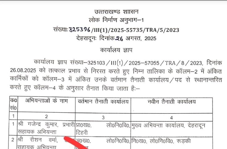 देहरादून। लोक निमाण विभाग में छह सहायक अभियंताओं का तबादला किया गया है। सभी अभियंताओं को तत्काल नई तैनाती स्थल पर ज्वाइन करने के आदेश दिए गए हैं।