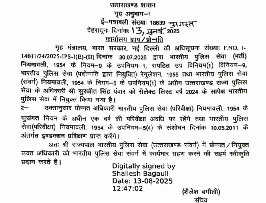 देहरादून। उत्तराखण्ड राज्य पुलिस सेवा के अधिकारी सुरजीत सिंह पंवार को सेलेक्ट लिस्ट वर्ष 2024 के सापेक्ष भारतीय पुलिस सेवा में नियुक्त किया गया है। प्रोन्नत अधिकारी भारतीय पुलिस सेवा (परिवीक्षा) नियमावली, 1954 के सुसंगत नियम के अधीन एक वर्ष की परिवीक्षा अवधि पर रहेंगे तथा भारतीय पुलिस सेवा (परिवीक्षा) नियमावली, 1954 के उपनियम-5 (4) के संशोधन 10.05.2011 के अंतर्गत इण्डक्शन प्रशिक्षण प्राप्त करेंगे।