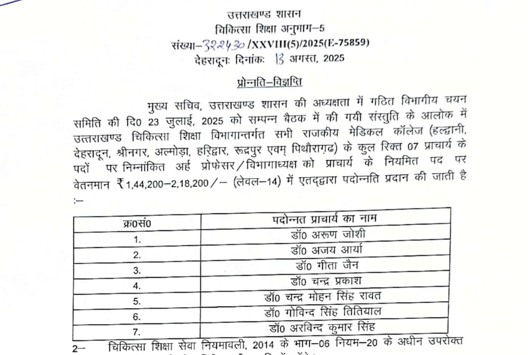 देहरादून। उत्तराखण्ड चिकित्सा शिक्षा विभागान्तर्गत सभी राजकीय मेडिकल कॉलेजों हल्द्वानी, देहरादून, श्रीनगर, अल्मोड़ा, हरिद्वार, रूद्रपुर एवं पिथौरागढ़ में प्राचार्य के 7 रिक्त नियमित पदों पर प्रोफेसरों एवं विभागाध्यक्षों को पदोन्नति प्रदान की गई है। मुख्य सचिव की अध्यक्षता में गठित विभागीय चयन समिति की 23 जुलाई 2025 को सम्पन्न बैठक में की गई संस्तुति के आधार पर, वरिष्ठ शिक्षकों को वेतनमान ₹1,44,200-2,18,200 (लेवल-14) में प्राचार्य पद पर पदोन्नत किया गया। इन्हें मिली पदोन्नति डॉ. अरुण जोशी डॉ. अजय आर्या डॉ. गीता जैन डॉ. चन्द्र प्रकाश डॉ. चन्द्र मोहन सिंह रावत डॉ. गोविन्द सिंह तितियाल डॉ. अरविन्द कुमार सिंह पदोन्नत प्राचार्य 2 [more…]