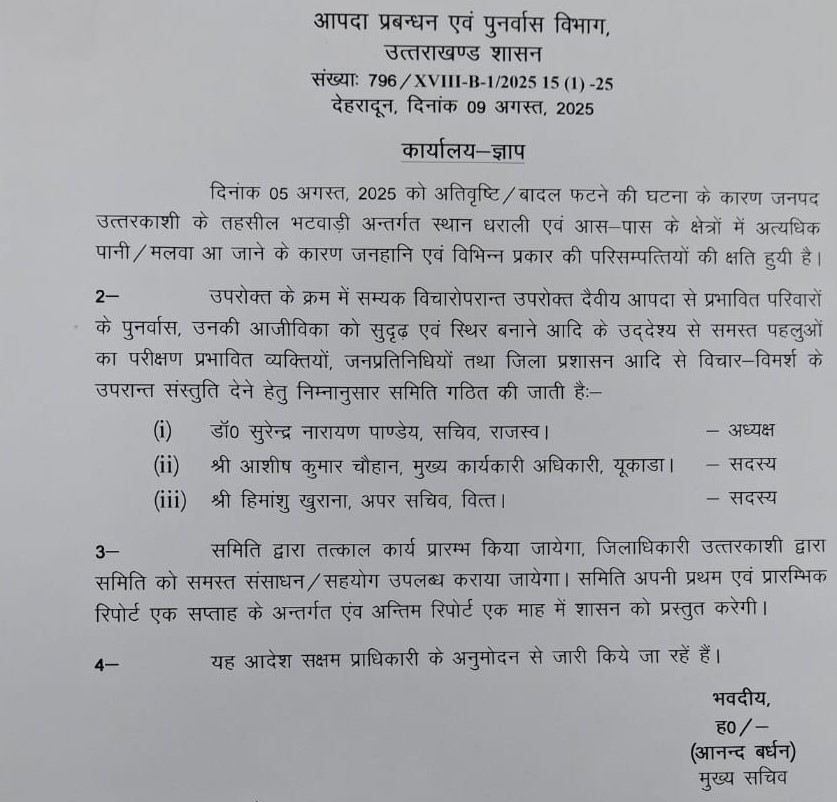 देहरादून। धराली में हुई दैवीय आपदा से प्रभावित परिवारों के पुनर्वास, उनकी आजीविका को सुदृढ़ एवं स्थिर बनाने आदि के उद्देश्य से सभी के विचार-विमर्श के बाद संस्तुति देने के लिए समिति गठित की गई है। सचिव आपदा प्रबन्धन एवं पुनर्वास विभाग विनोद कुमार सुमन ने बताया कि सचिव राजस्व डा. सुरेंद्र नारायण पाण्डेय समिति के अध्यक्ष होंगे। जबकि यूकाडा के सीईओ आशीष कुमार चैहान और अपर सचिव वित्त हिमाशु खुराना समिति के सदस्य होंगे। समिति एक सप्ताह के अंदर अपनी प्रारंभिक रिपोर्ट तथा एक माह के अंदर अंतिम रिपोर्ट शासन को देगी।