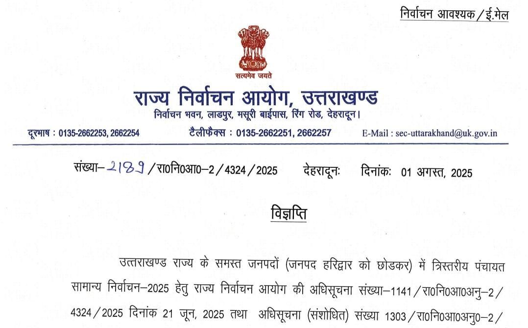 देहरादून। उत्तराखण्ड में त्रिस्तरीय पंचायत सामान्य निर्वाचन-2025 सम्पन्न होने के बाद आज, 1 अगस्त 2025 को शाम 6 बजे से आदर्श आचरण संहिता समाप्त कर दी गई है।