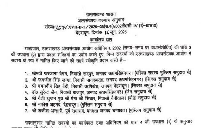 देहरादून। उत्तराखंड सरकार ने अल्पसंख्यक आयोग में सात सदस्य नामित किए हैं। नामित किए गए सदस्यों में तीन मुस्लिम, दो सिख और एक-एक जैन व बोद्ध समुदाय से शामिल हैं।