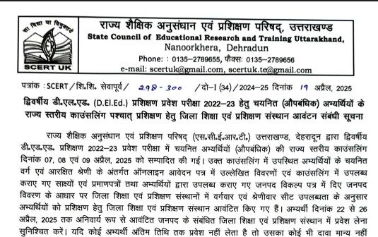 देहरदून। राज्य शैक्षिक अनुसंधान एवं प्रशिक्षण परिषद् ने द्विवर्षीय डी.एड.एड. प्रशिक्षण 2022-23 प्रवेश परीक्षा में चयनित अभ्यर्थियों (औपबंधिक) की 07, 08 एवं 09 अप्रैल, 2025 को राज्य स्तरीय काउंसलिंग करवाई थी। काउंसलिंग में उपस्थित अभ्यर्थियों के चयनित वर्ग एवं आरक्षित श्रेणी के अंतर्गत ऑनलाइन आवेदन पत्र में उल्लेखित विवरणों एवं काउंसलिंग में उपलब्ध कराए गए साक्ष्यों एवं प्रमाणपत्रों तथा अभ्यर्थियों द्वारा उपलब्ध कराए गए जनपद विकल्प पत्र में दिए जनपद विवरण के आधार पर जिला शिक्षा एवं प्रशिक्षण संस्थानों में वर्गवार एवं श्रेणीवार सीट उपलब्धता के अनुसार अभ्यर्थियों को प्रशिक्षण हेतु जिला शिक्षा एवं प्रशिक्षण संस्थान आवंटित किए गए हैं। [more…]