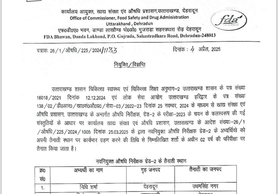 उत्तराखण्ड ड्रग विभाग में हुई 18 नए औषधि निरीक्षकों की नियुक्ति, तैनाती आदेश जारी