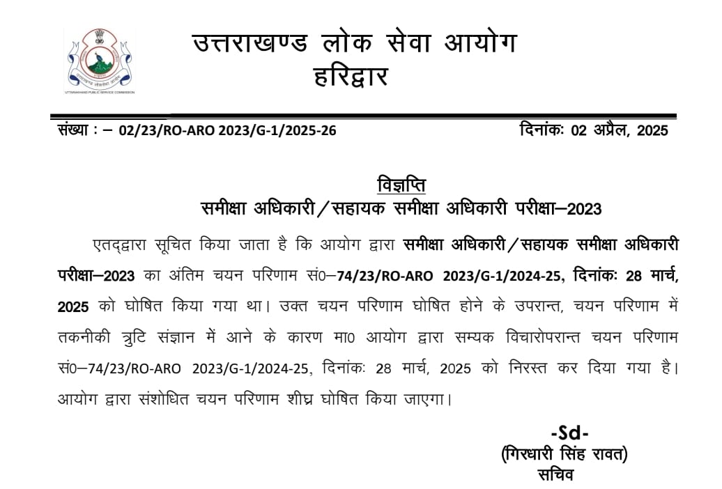 देहरादून। उत्तराखंड लोक सेवा आयोग ने समीक्षा अधिकारी/सहायक समीक्षा अधिकारी परीक्षा-2023 का रिजल्ट निरस्त कर दिया हैं। आयोग ने 28 मार्च को इस भर्ती परीक्षा का रिजल्ट घोषित किया था। आयोग की ओर से जारी विज्ञप्ति में कहा गया है कि रिजल्ट में कुछ तकनीकि त्रुटि के कारण रिजल्ट निरस्त किया गया है। आयोग द्वारा शीघ्र की संशोधित रिजल्ट घोषित किया जाएगा।
