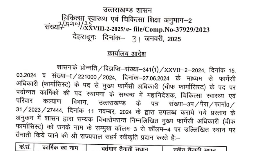 Home/उत्तराखंड/स्वास्थ्य विभाग में 75 चीफ फार्मासिस्टों के तबादले उत्तराखंड हाल ही में मिली थी फार्मासिस्ट से चीफ फार्मासिस्ट पद पर पदोन्नति
