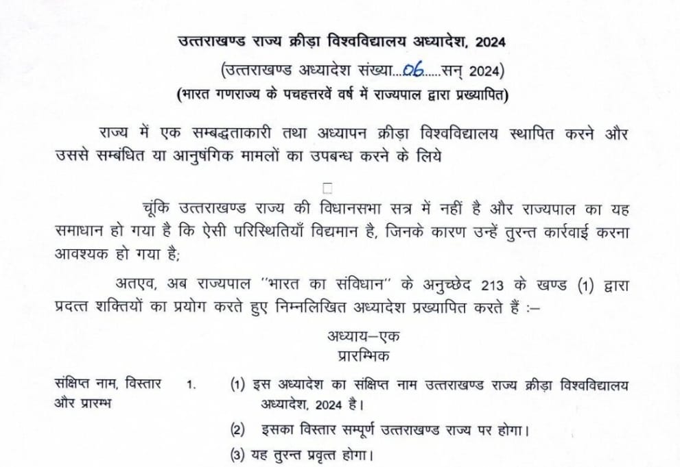 खेल विश्वविद्यालय अध्यादेश पर राजभवन की मुहर