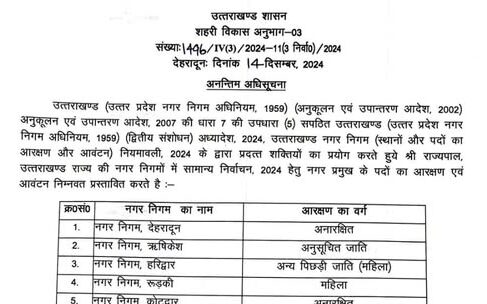 देहरादून। शासन ने नगर पालिका, नगर पंचायत और नगर निगमों में सामान्य निर्वाचन -2024 हेतु अध्यक्ष और मेयर पदों पर आरक्षण की अनन्तिम अधिसूचना जारी कर दी है।शासन ने प्रस्तावित आरक्षण पर सर्वसाधारन से आपत्ति एवं सुझाव मांगे हैं। यदि किसी का कोई सुझाव या आपत्ति हो तो वह लिखित रुप में निदेशक, शहरी विकास को एक सप्ताह के अंदर अपनी आपित्त दर्ज करा सकता है।