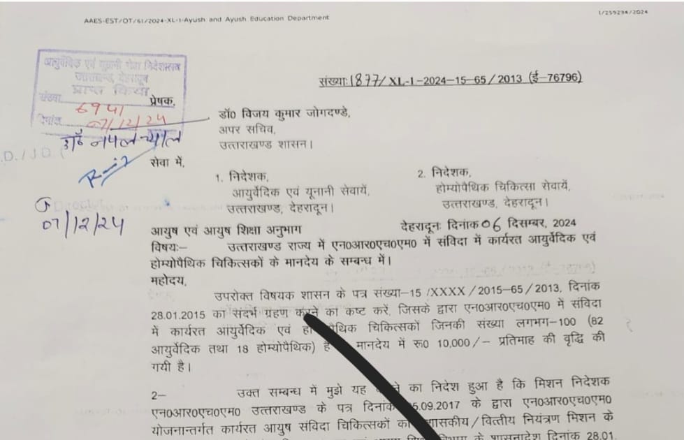 देहरादून। शासन ने राष्ट्रीय ग्रामीण स्वास्थ्य मिशन (एनआरएचएम) में संविदा में कार्यरत आयुर्वेदिक एवं होम्योपैथिक चिकित्सकों के मानदेय में दस हजार रुपए की वृद्वि को वापस ले लिया है। एनआरएचएम योजना में 82 आयुर्वेदिक तथा 18 होम्योपैथिक चिकित्सक संविदा में कार्यरत है। शासन की ओर से जारी आदेश में कहा गया है कि एनआरएचएम योजनान्तर्गत कार्यरत आयुष संविदा चिकित्सकों का शासकीय/वित्तीय नियंत्रण मिशन के अधीन ले लिया गया है। ऐसे में आयुष एवं आयुष चिकित्सा विभाग के 28 जनवरी 2015 को जारी 10,000 रुपए के अतिरिक्त मानदेय का कोई औचित्य नहीं रह जाता। देखें आदेश: