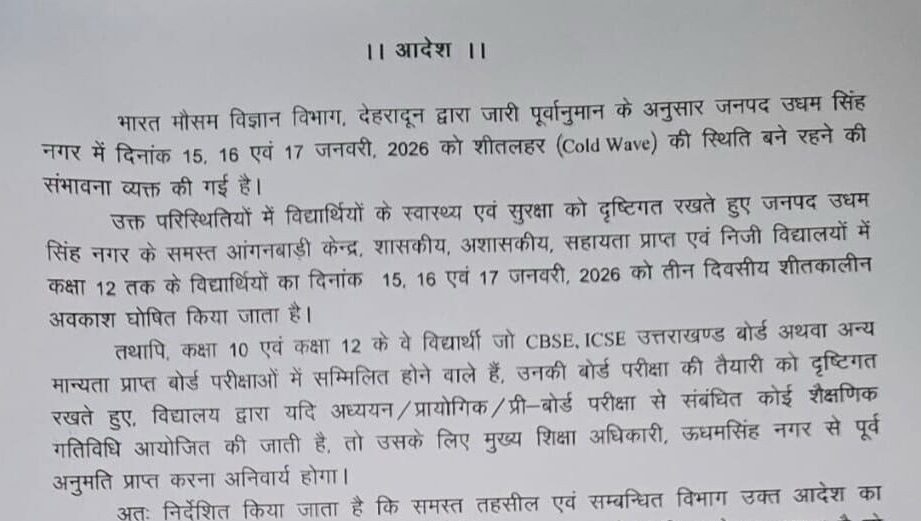 ऊधमसिंह नगर। भारत मौसम विज्ञान विभाग, देहरादून द्वारा ऊधमसिंह नगर जनपद में अगले कुछ दिनों शीतलहर (Cold Wave) की स्थिति बने रहने की संभावना व्यक्त की गई है। लिहाजा, विद्यार्थियों के स्वास्थ्य एवं सुरक्षा को दृष्टिगत ऊधमसिंह नगर जनपद के समस्त आंगनबाड़ी केन्द्र, शासकीय, अशासकीय, सहायता प्राप्त एवं निजी विद्यालयों में कक्षा 12 तक के विद्यार्थियों का 15, 16 एवं 17 जनवरी, 2026 को तीन दिवसीय शीतकालीन अवकाश घोषित किया गया है। डीएम की और से जारी आदेश में कहा गया है कि कक्षा 10 एवं कक्षा 12 के वे विद्यार्थी जो CBSE, ICSE, उत्तराखण्ड बोर्ड अथवा अन्य मान्यता प्राप्त [more…]