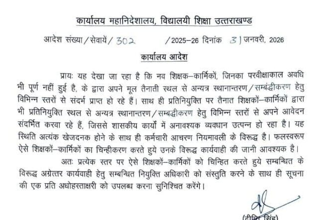 देहरादून। शिक्षा विभाग अपने मूल तैनाती स्थल से अन्यत्र स्थानान्तरण/सम्बंद्धीकरण के लिए विभिन्न स्तरों से सिफारिश करने वाले शिक्षक-कर्मिचारियों को चिन्हित कर उनके खिलाफ कार्रवाई करेगा। महानिदेशक विद्यालयी शिक्षा दीप्ति सिंह की ओर से जारी आदेश में कहा गया है कि प्रायः यह देखा जा रहा है कि नए शिक्षक-कार्मिकों, जिनका परवीक्षाकाल अवधि भी पूर्ण नहीं हुई है, के द्वारा अपने मूल तैनाती स्थल से अन्यत्र स्थानान्तरण/सम्बंद्धीकरण के लिए विभिन्न स्तरों से सिफारिश की जा रही है। साथ ही प्रतिनियुक्ति पर तैनात शिक्षकों-कार्मिकों द्वारा भी प्रतिनियुक्ति स्थल से अन्यत्र स्थानान्तरण/सम्बद्धीकरण हेतु विभिन्न स्तरों से अपने आवेदन संदर्भित करवा रहे हैं, [more…]