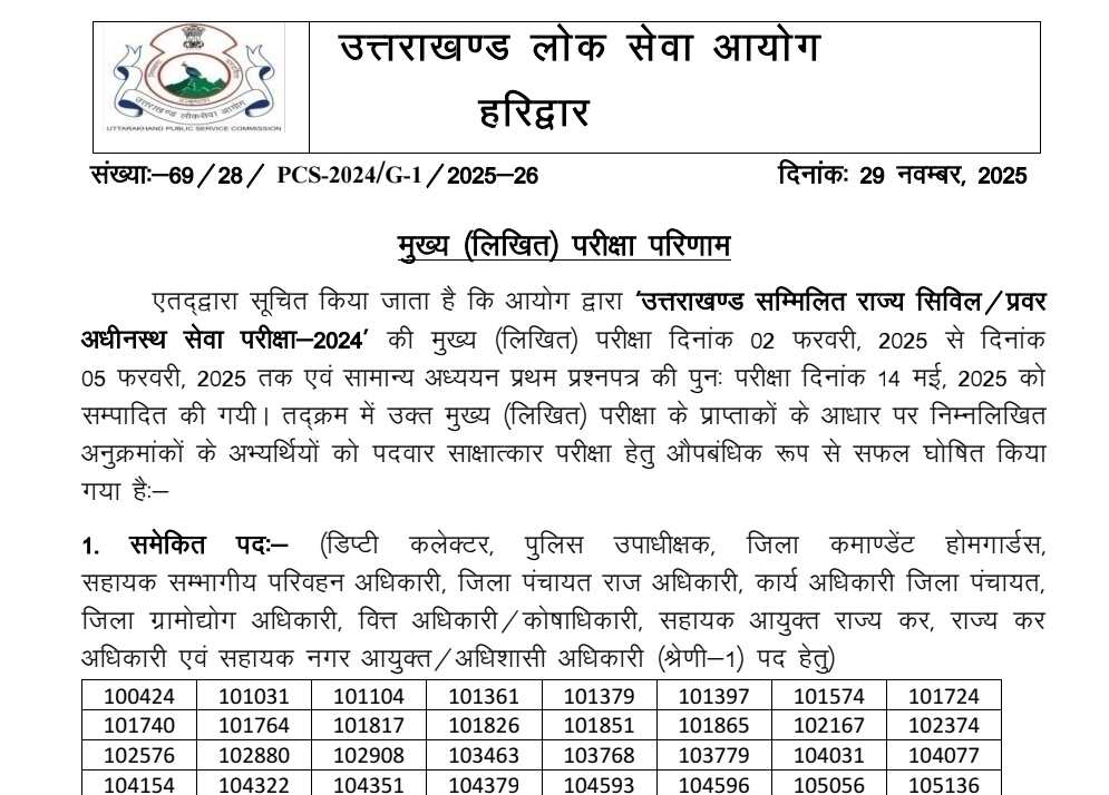 देहरादून। उत्तराखंड लोक सेवा आयोग द्वारा ‘उत्तराखण्ड सम्मिलित राज्य सिविल /प्रवर अधीनस्थ सेवा परीक्षा-2024’ की मुख्य (लिखित) परीक्षा 02 फरवरी, 2025 से 05 फरवरी, 2025 तक एवं सामान्य अध्ययन प्रथम प्रश्नपत्र की पुनः परीक्षा 14 मई, 2025 को सम्पादित की गयी। मुख्य (लिखित) परीक्षा के प्राप्ताकों के आधार पर इन अभ्यर्थियों को पदवार साक्षात्कार परीक्षा हेतु औपबंधिक रूप से सफल घोषित किया गया है।