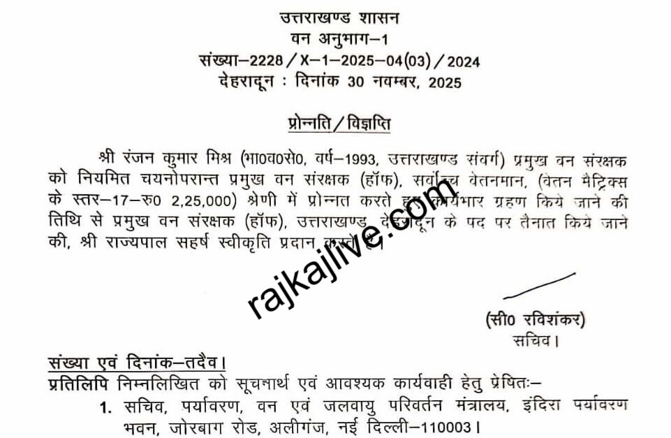 देहरादून। उत्तराखंड वन विभाग को नया मुखिया मिल गया है। राज्य सरकार ने अब रंजन कुमार मिश्र को प्रमुख वन संरक्षक (हॉफ) नियुक्त किया है। रंजन कुमार मिश्र वर्ष 1993 बैच के आईएफएस अधिकारी हैं। अब तक समीर सिन्हा के पास हाॅफ की जिम्मेदारी थी। वे आज ही सेवानिवृत्त हुए हैं।