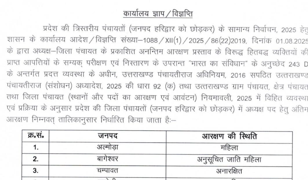 Estimated read time 1 min read उत्तराखण्ड उत्तराखंड में जिला पंचायत अध्यक्षों की अंतिम आरक्षण सूची जारी August 6, 2025 Anshul Rauthan
