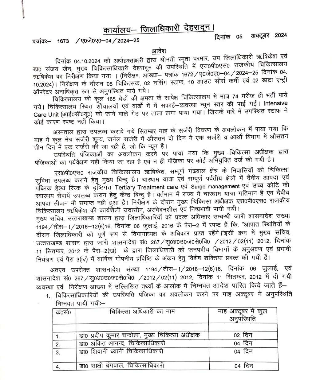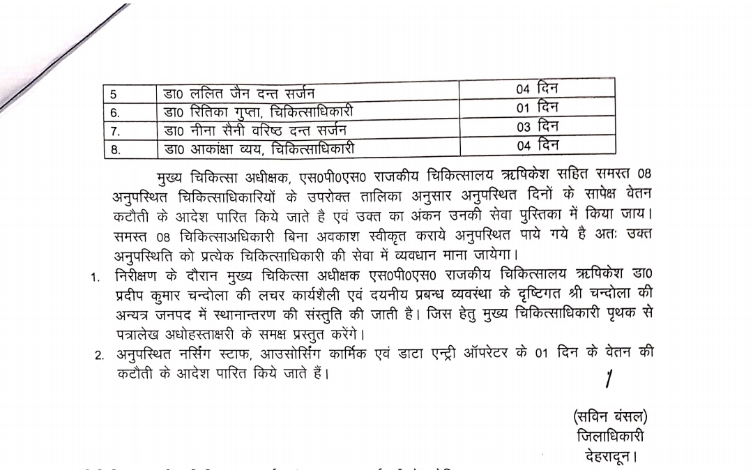 देहरादून। जिलाधिकारी संविन बंसल ने 04 अक्टूबर के एसपीएस राजकीय चिकित्सालय ऋषिकेश का औचक निरीक्षण किया था। निरीक्षण के दौरान 8 चिकित्सक, 2 नर्सिंग स्टाफ, 10 आउटसोर्स कर्मी एवं 2 डाटा एन्ट्री ऑपरेटर अनाधिकृत रूप से अनुपस्थित पाए गए। जिलाधिकारी ने सभी अनुपस्थित कर्मियों का वेतन रोकने के साथ ही मुख्य चिकित्सा अधीक्षक डा० प्रदीप कुमार चन्दोला का अन्यत्र जनपद में स्थानान्तरण की संस्तुति की है।
