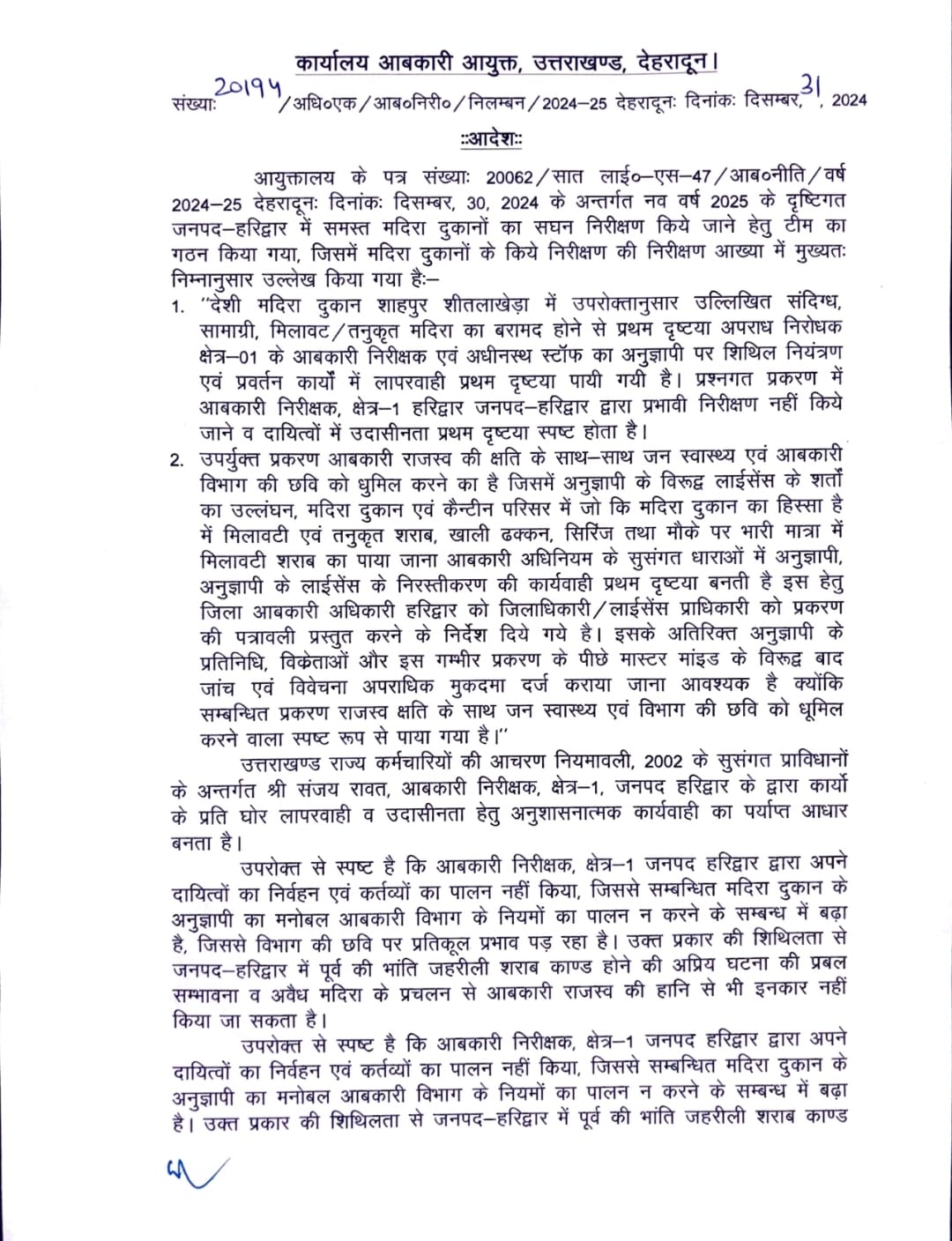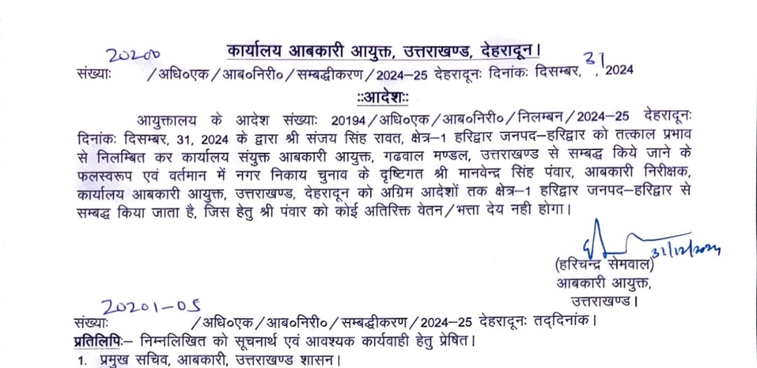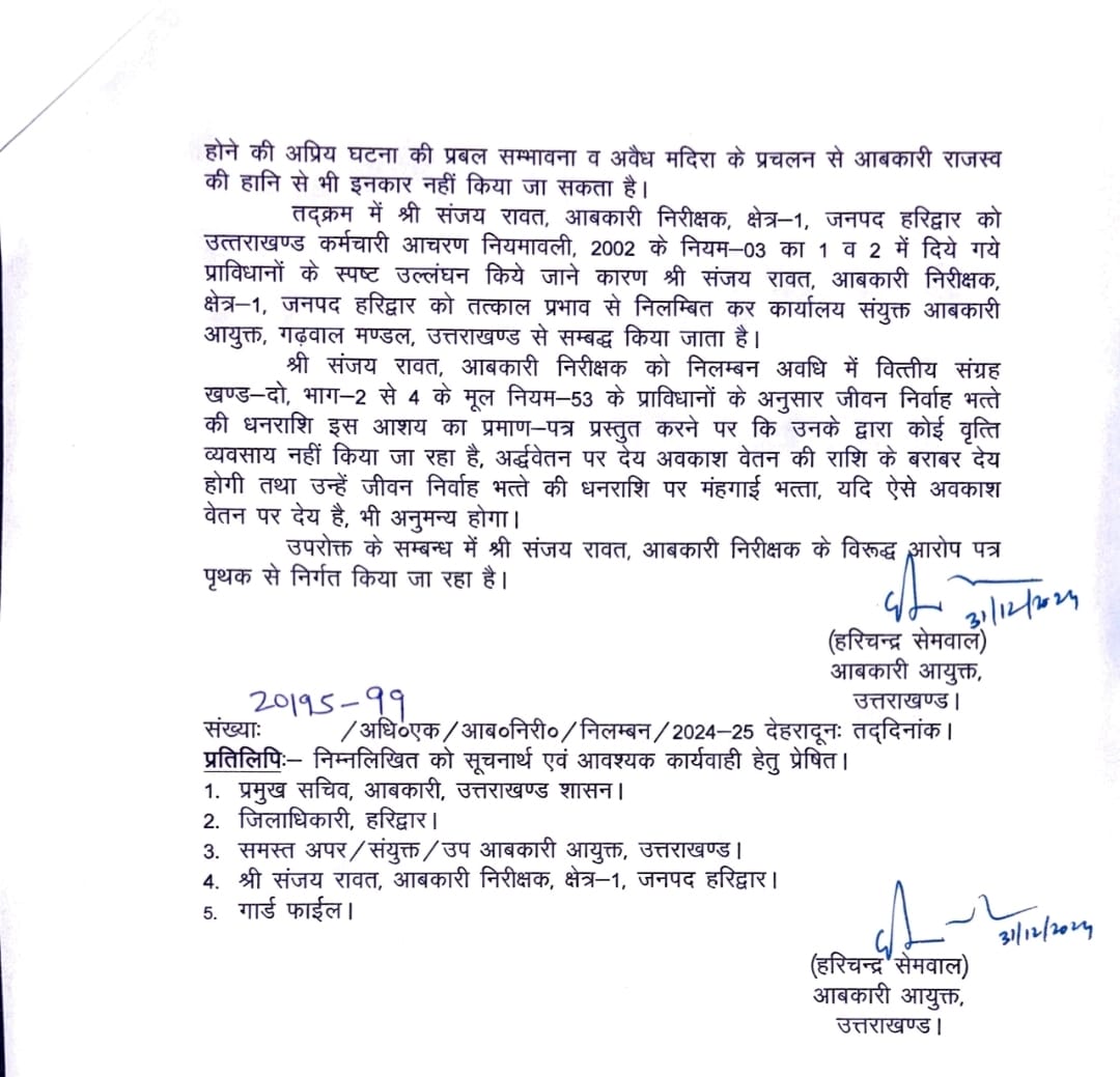 आबकारी निरीक्षक मानवेन्द्र सिंह पंवार और संजय रावत निलंबित