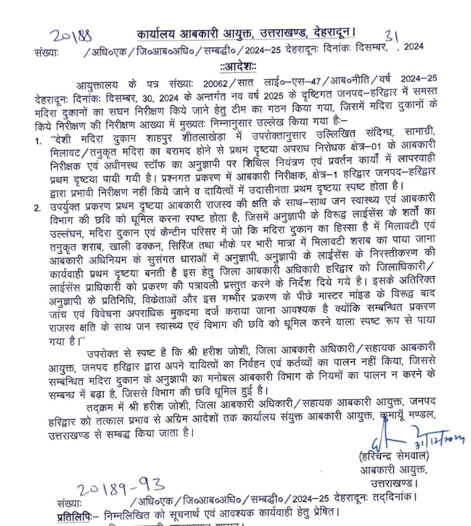 हरिद्वार के जिला आबकारी अधिकारी हरीश जोशी को किया कार्यालय संयुक्त आबकारी आयुक्त, कुमायूं मंडल में अटैच