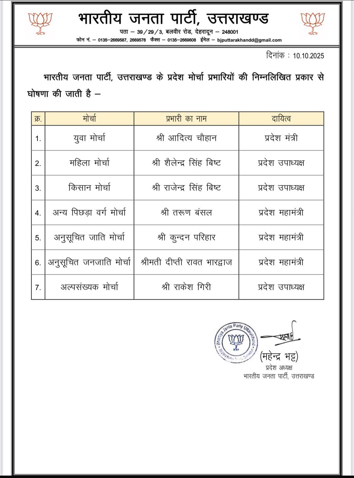 प्रदेशाध्यक्ष द्वारा तय जिम्मेदारी के तहत, युवा मोर्चा के लिए प्रदेश मंत्री आदित्य चौहान, महिला मोर्चा के लिए प्रदेश उपाध्यक्ष शैलेंद्र बिष्ट, किसान मोर्चा के लिए प्रदेश उपाध्यक्ष राजेंद्र बिष्ट, अन्य पिछड़ा वर्ग मोर्चा के लिए प्रदेश महामंत्री तरुण बंसल, अनुसूचित जाति मोर्चा के लिए प्रदेश महामंत्री कुंदन परिहार अनुसूचित जनजाति मोर्चा के लिए प्रदेश महामंत्री दीप्ति रावत और अल्पसंख्यक मोर्चा के लिए प्रदेश उपाध्यक्ष राकेश गिरी प्रभारी के दायित्व का निर्वहन करेंगे।