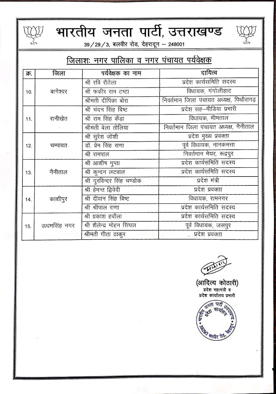 देहरादून। भाजपा ने निकाय चुनाव के लिए पर्यवेक्षक नियुक्त कर दिये हैं। पार्टी की ओर से इसकी सूची जारी कर दी गयी है।