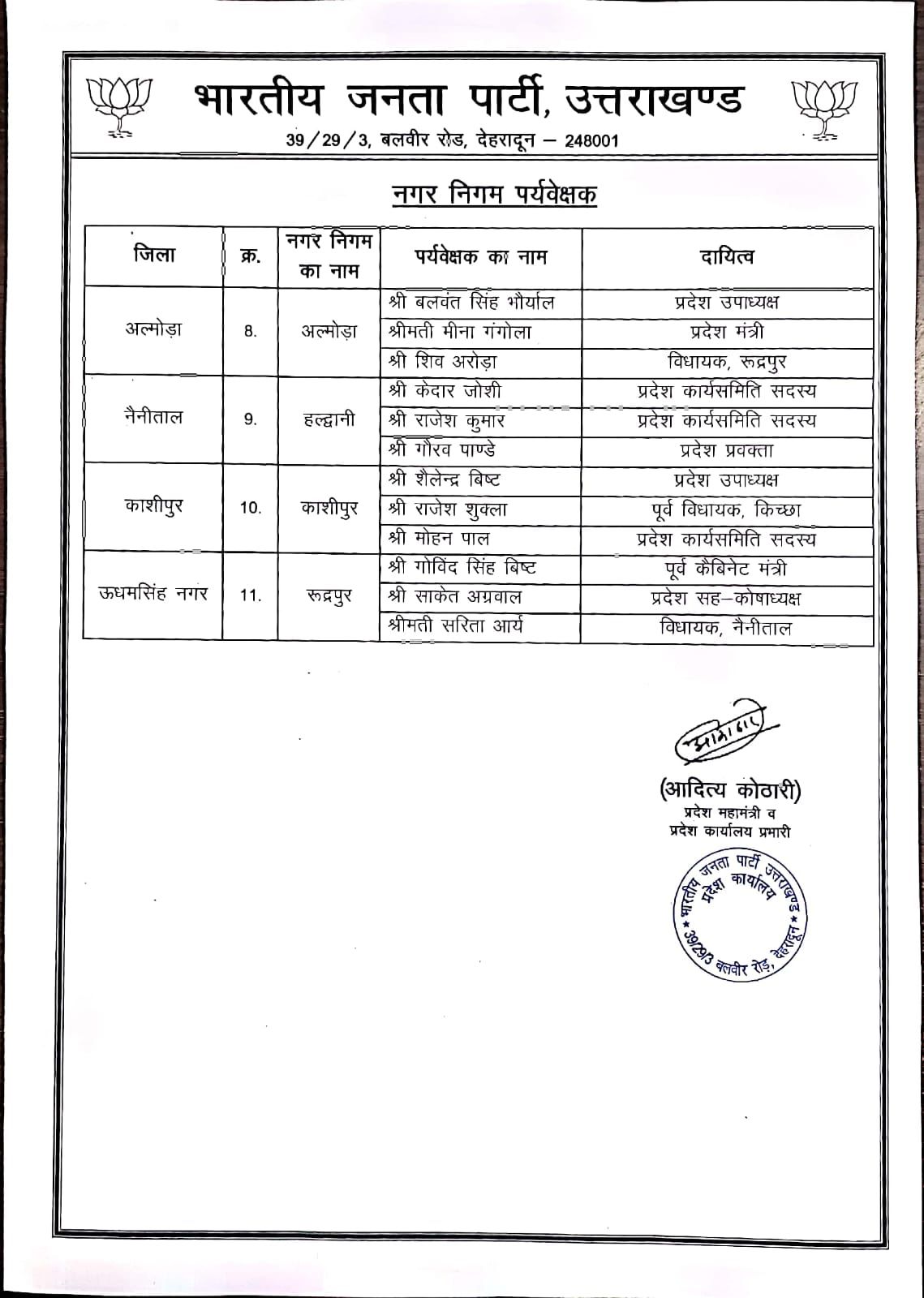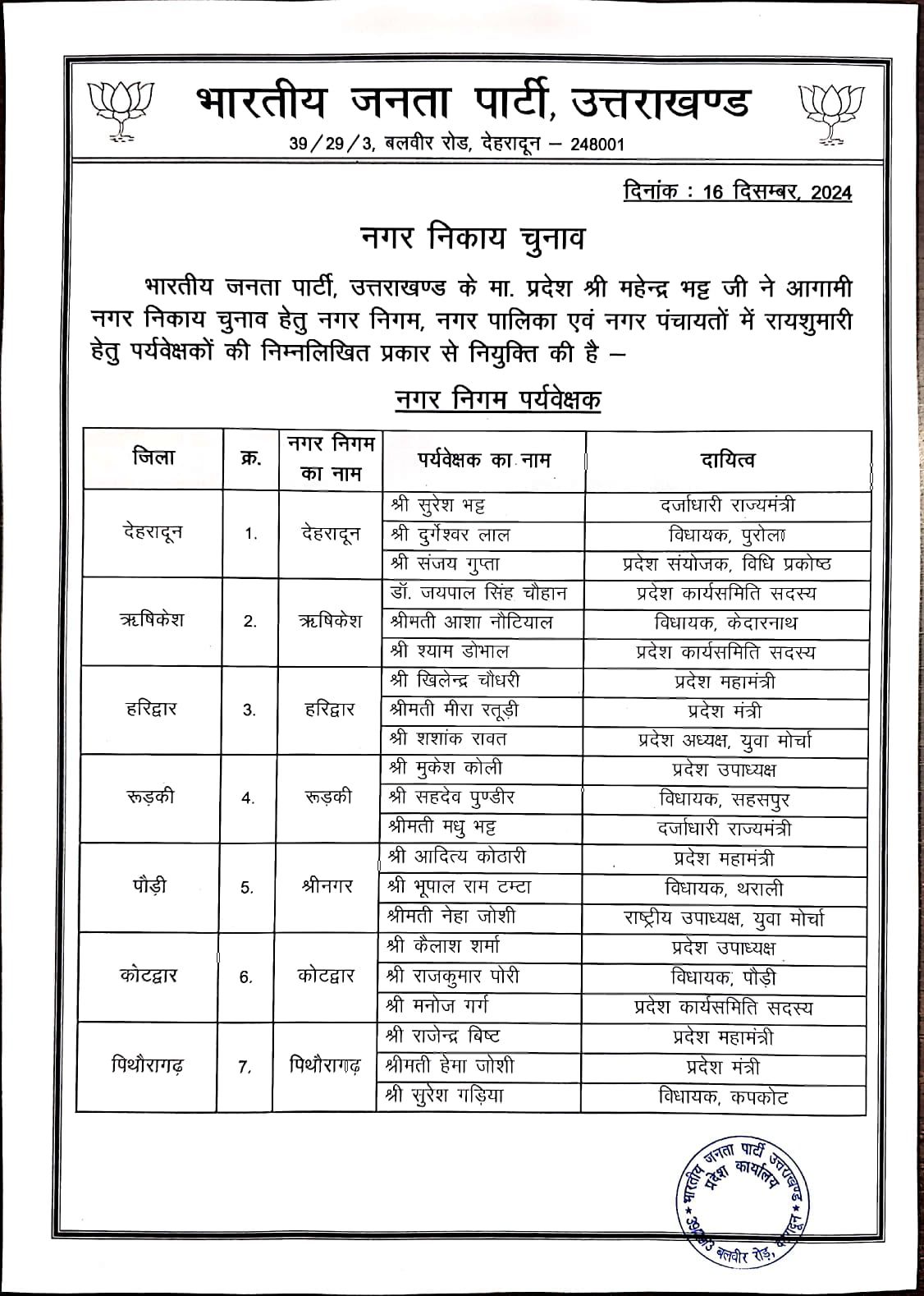 देहरादून। भाजपा ने निकाय चुनाव के लिए पर्यवेक्षक नियुक्त कर दिये हैं। पार्टी की ओर से इसकी सूची जारी कर दी गयी है।