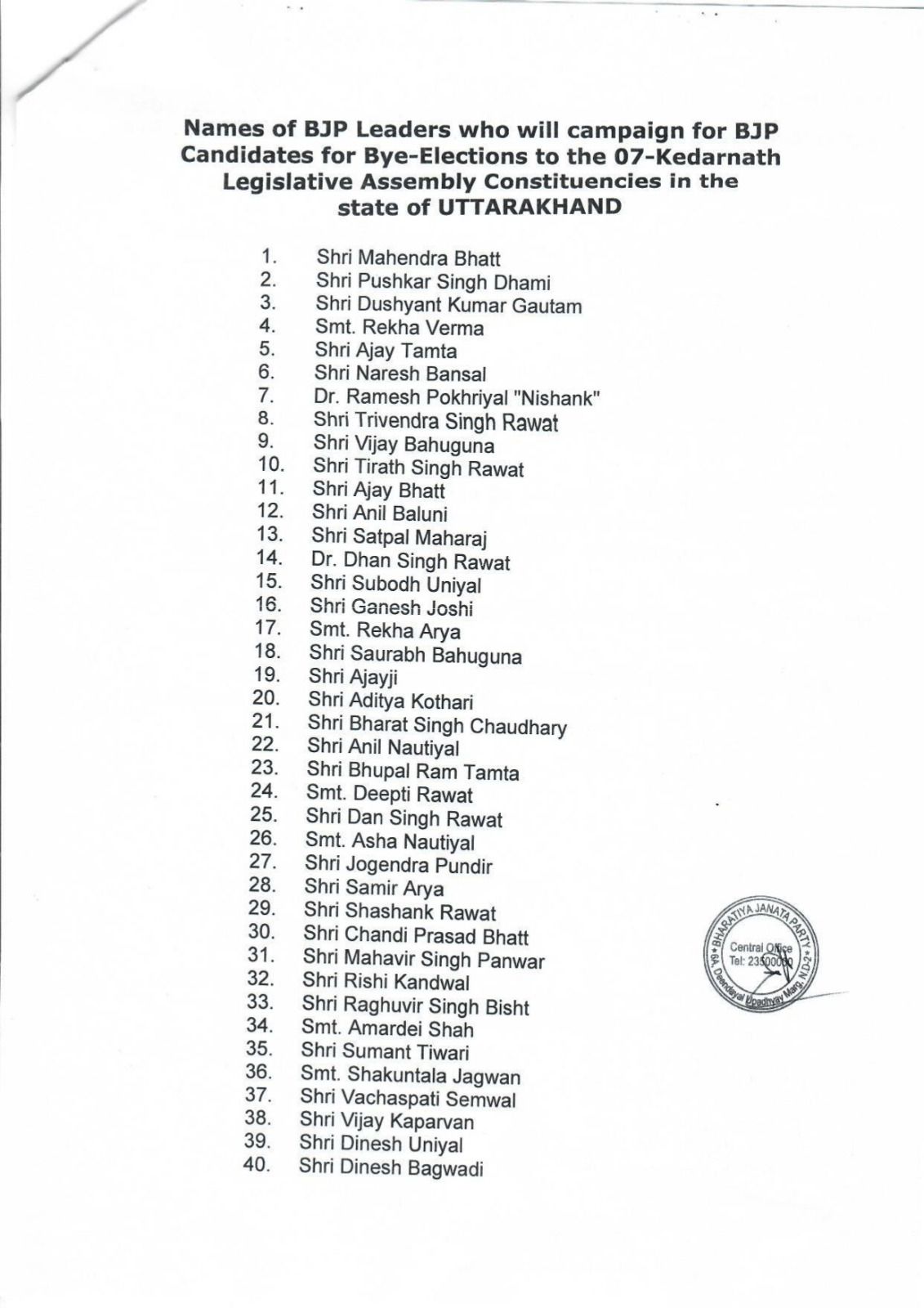 देहरादून। भारतीय जनता पार्टी केंद्रीय नेतृत्व ने केदारनाथ उपचुनाव के लिए 40 स्टार प्रचारकों की सूची जारी कर दी है ।