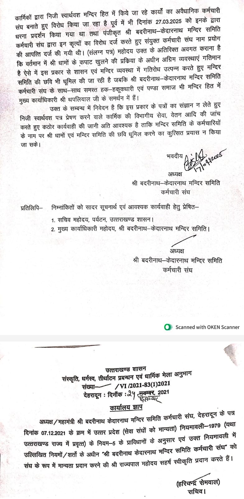 कर्मचारी संघ ( मान्यता प्राप्त) ने इस सम्बन्ध में मुख्य सचिव को अवगत कराया है कि संस्कृति, धर्मस्व, तीर्थाटन प्रबन्धन एवं धार्मिक मेला अनुभाग, देहरादून के कार्यालय ज्ञाप संख्या 895/VI/2021-83(1)2021 दिनांक 24 दिसम्बर 2021 द्वारा श्री बदरीनाथ केदारनाथ मन्दिर समिति कर्मचारी संघ को संघ के रूप में मान्यता प्राप्त है तथा मन्दिर समिति में कार्यरत कार्मिकों के हित के लिए कर्मचारियों का मान्यता प्राप्त संघ संकल्पबद्ध है। कहा कि सोशल मीडिया पर प्रचारित संयुक्त कर्मचारी संघ(अपंजीकृत )के नाम से प्रेषित पत्र का मान्यता प्राप्त कर्मचारी संघ घोर विरोध करता है तथा इस प्रकार से मन्दिर समिति एवं संघ की छवि धूमिल किये जाने में लिप्त मंदिर समिति कार्मिकों के विरूद्ध कार्यवाही किये की जाने की मांग करता है।