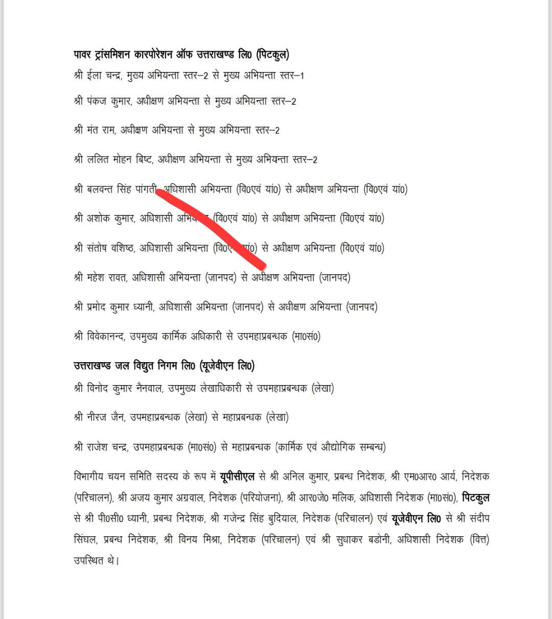 देहरादून। आज ऊर्जा भवन मुख्यालय में मुख्य सचिव एवं अध्यक्ष, यूपीसीएल, पिटकुल, यूजेवीएन लि० आनन्द बर्द्धन की अध्यक्षता में ऊर्जा के तीनों निगमों की विभागीय चयन समिति की बैठक हुई, जिसमें डा० अहमद इकबाल, अपर सचिव (ऊर्जा), उमेश नारायण पाण्डेय, अपर सचिव (औद्योगिक विकास) व तीनों निगमों के प्रबन्ध निदेशकों एवं अन्य निदेशकों ने चयन समिति सदस्य के रूप में प्रतिभाग किया। समिति द्वारा विभागीय नियमावली एवं आदेशों के विचारोपरान्त तीनों निगमों में वर्तमान में रिक्त पदों एवं 30 जून 2026 तक होने वाले परिणामी रिक्तयों को सम्मिलित करते हुए कुल 27 पदों के सापेक्ष अधिकारियों की पदोन्नति पर संस्तुति की गई।