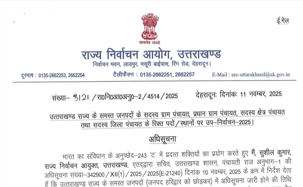 देहरादून। राज्य निर्वाचन आयोग ने त्रिस्तरीय पंचायतों के उपचुनाव की अधिसूचना जारी कर दी है। ग्राम पंचायत सदस्य, ग्राम प्रधान, क्षेत्र पंचायत सदस्य एवं जिला पंचायत सदस्य के पदों पर उपचुनाव हेतु नाम निर्देशन पत्र 13 व 14 नवम्बर, 2025 को पूर्वाह्न 10 बजे से अपराह्न 5 बजे तक जमा किए जाएंगे। नाम निर्देशन पत्रों की जांच 15 नवम्बर, 2025 को पूर्वाह्न 10रू00 से कार्य समाप्ति तक की जाएगी, जबकि नाम वापसी की अंतिम तिथि 16 नवम्बर, 2025 को पूर्वाह्न 10 बजे से अपराह्न 3 बजे तक निर्धारित की गई। उसी दिन प्रतीक चिन्ह आवंटन की कार्यवाही भी की जाएगी। [more…]