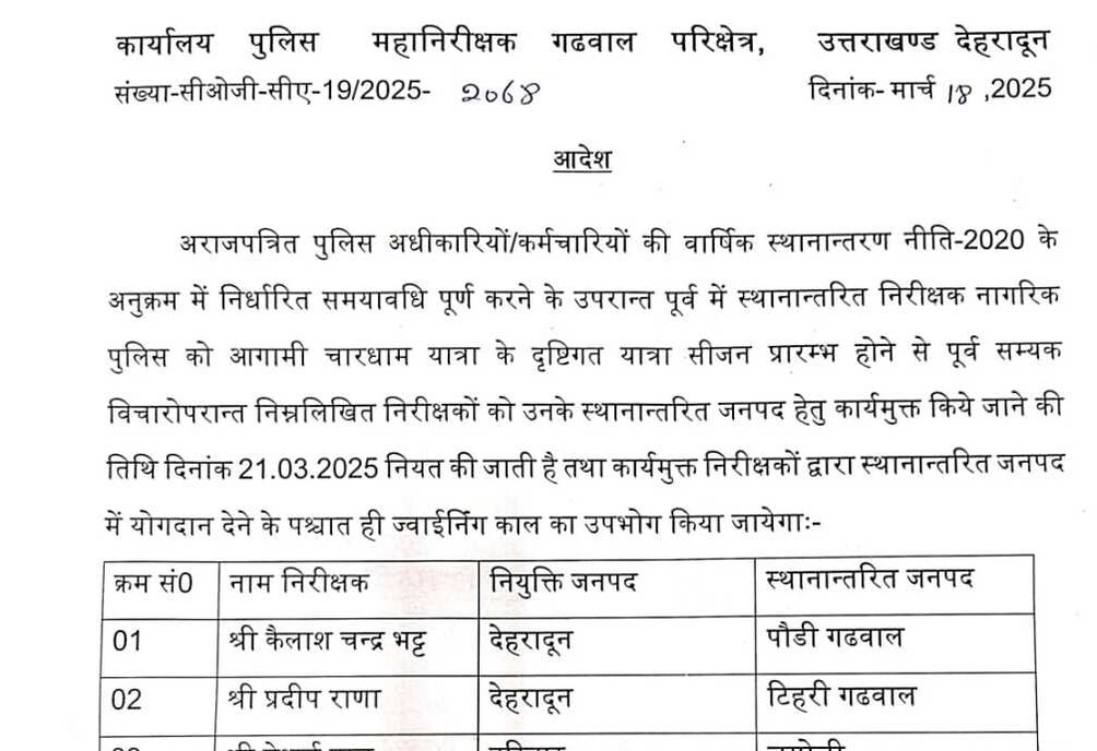 उत्तराखंड पुलिस में बम्पर तबादले, वर्षों से मैदान में जमे इंस्पेक्टरों और सब इस्पेक्टरों को भेजा पहाड़