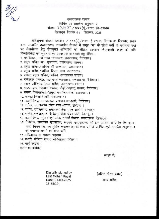 देहरादून। मुख्यमंत्री पुष्कर सिंह धामी ने अपने एक और वायदे को पूरा करते हुए, सेवामुक्त होने वाले अग्निवीरों को विभिन्न विभागों की वर्दीधारी सेवाओं में दस प्रतिशत क्षैतिज आरक्षण प्रदान कर दिया है। इस संबंध में सोमवार को कार्मिक एवं सर्तकता विभाग की ओर से विधिवित तौर पर उत्तराखंड राज्याधीन सेवाओं में समूह ग के सीधी भर्ती के वर्दीधारी पदों पर सेवायोजन हेतु सेवामुक्त अग्निवीरों को क्षैतिज आरक्षण नियमावली – 2025 जारी कर दी है।