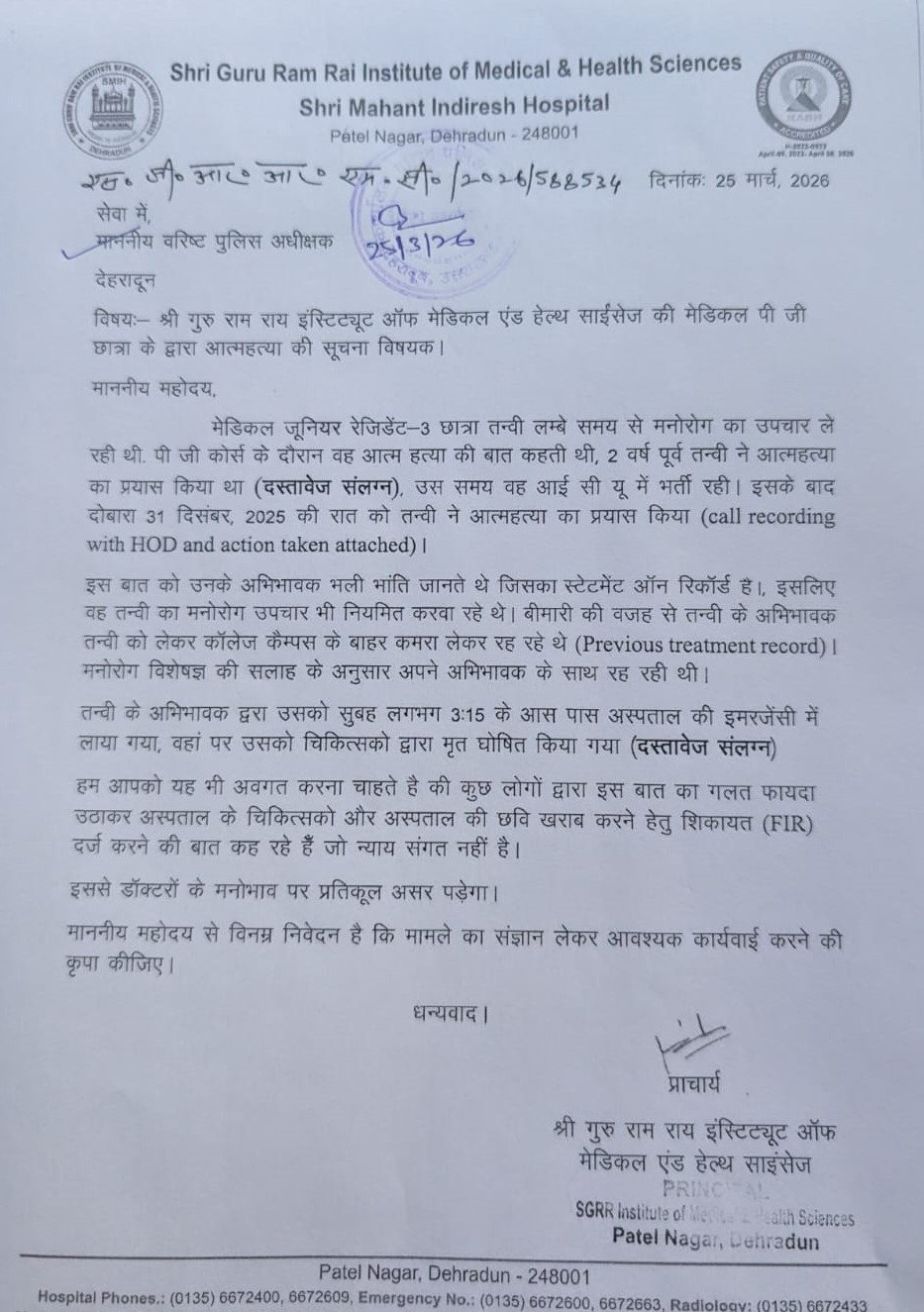 देहरादून। एसजीआरआर मेडिकल कॉलेज प्रबंधन ने वरिष्ठ पुलिस अधीक्षक को पत्र लिखकर पीजी डॉक्टर तन्वी के आत्महत्या मामले की जांच की मांग की है। काॅलेज प्रबंधन का कहना है कि तभी सभी परतों से पर्दा उठेगा। परदे के पीछे भी कोई ऐसा हो सकता है जो डॉ. तन्वी की आत्महत्या की घटना पर गुमराह कर रहा हो।