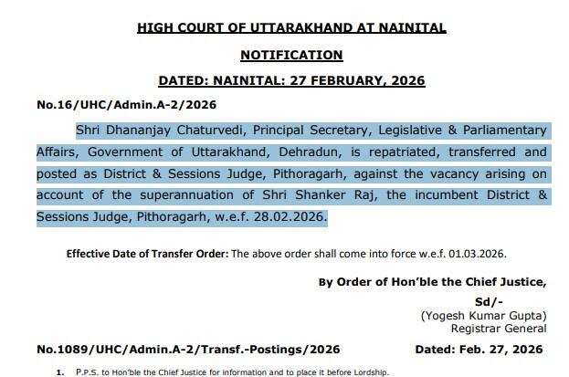 धनंजय चतुर्वेदी होंगे पिथौरागढ़ के नए जिला एवं सत्र न्यायाधीश