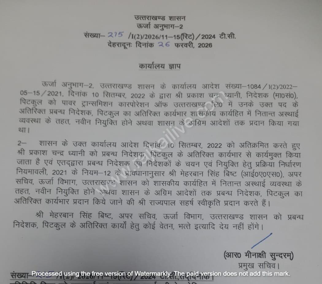 देहरादून। शासन में पावर ट्रान्समिशन कारपोरेशन ऑफ उत्तराखण्ड लिमिटेड (पिटकुल) के प्रभारी प्रबन्ध निदेशक पीसी ध्यानी को कार्यमुक्त कर दिया है। अपर सचिव, ऊर्जा मेहरबान सिंह बिष्ट को शासकीय कार्यहित में नितान्त अस्थाई व्यवस्था के तहत नई नियुक्ति होने अथवा शासन के अग्रिम आदेशों तक प्रबन्ध निदेशक, पिटकुल का अतिरिक्त कार्यभार सौंपा गया है।