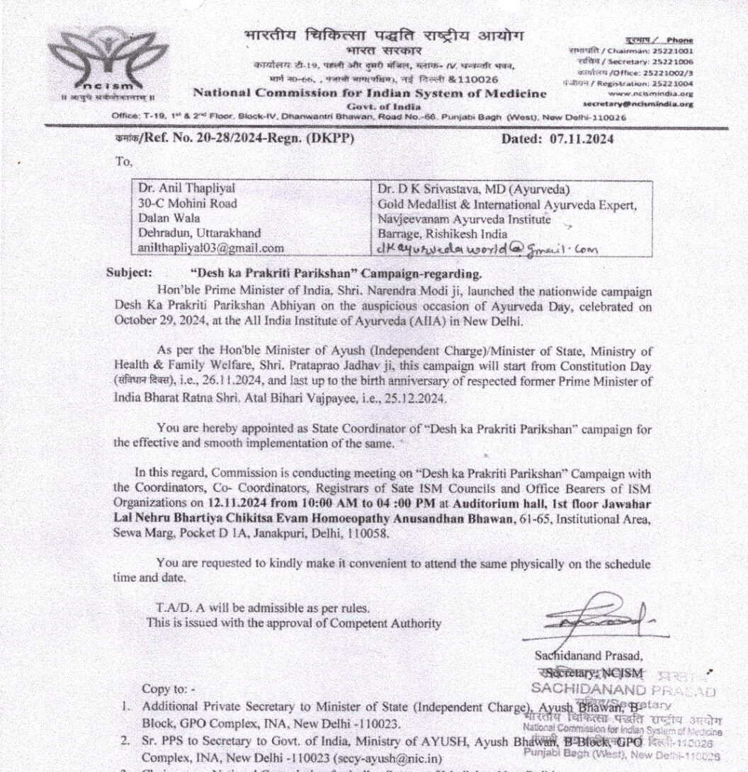 देहरादून। देश की पारंपरिक चिकित्सा को विश्व पटल पर नई पहचान दिलाने के लिए मुहिम गतिमान है। प्रधानमंत्री नरेन्द्र मोदी द्वारा देश की प्रकृति परीक्षण अभियान कैंपेन को देश भर में प्रचारित प्रसारित किया जा रहा है। इस क्रम में देश के विभिन्न राज्यों में देश का प्राकृतिक