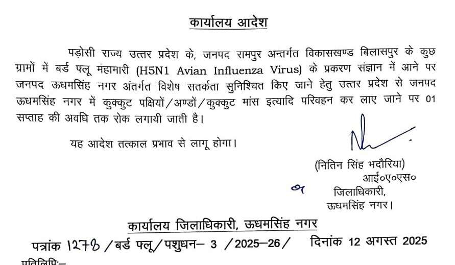 देहरादून।उत्तर प्रदेश के रामपुर जिले के बिलासपुर के कुछ गांवों में बर्ड फ्लू (एच-5एन-1) के मामले सामने आने के बाद ऊधमसिंह नगर में यूपी से आने वाले पोल्ट्री उत्पाद लाने पर रोक लगा दी है। ऊधम सिंह नगर जिला प्रशासन ने एहतियातन बाहरी क्षेत्रों से जनपद में कुक्कुट, अंडों और कुक्कुट मांस के परिवहन पर एक सप्ताह के लिए रोक लगा दी है।
