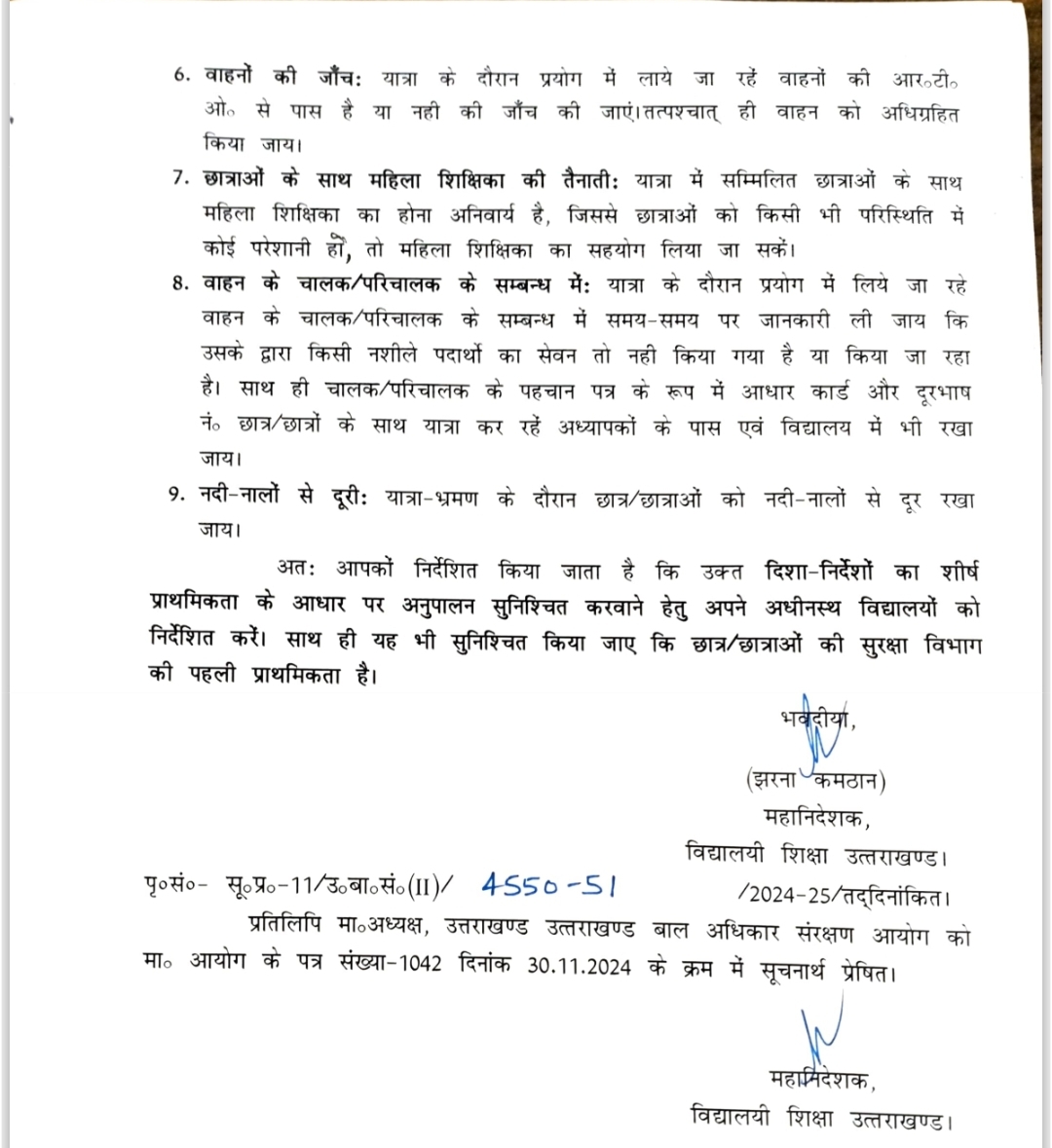 देहरादून। महानिदेशक, विद्यालयी शिक्षा झरना कमठान ने विद्यालयों द्वारा पर्यटक स्थलों और पार्कों की यात्राओं के दौरान बच्चों की सुरक्षा सुनिश्चित करने के लिए विस्तृत दिशा-निर्देश जारी किए हैं। उन्होंने कहा कि छात्र-छात्राओं की सुरक्षा विभाग की पहली प्राथमिकता है।