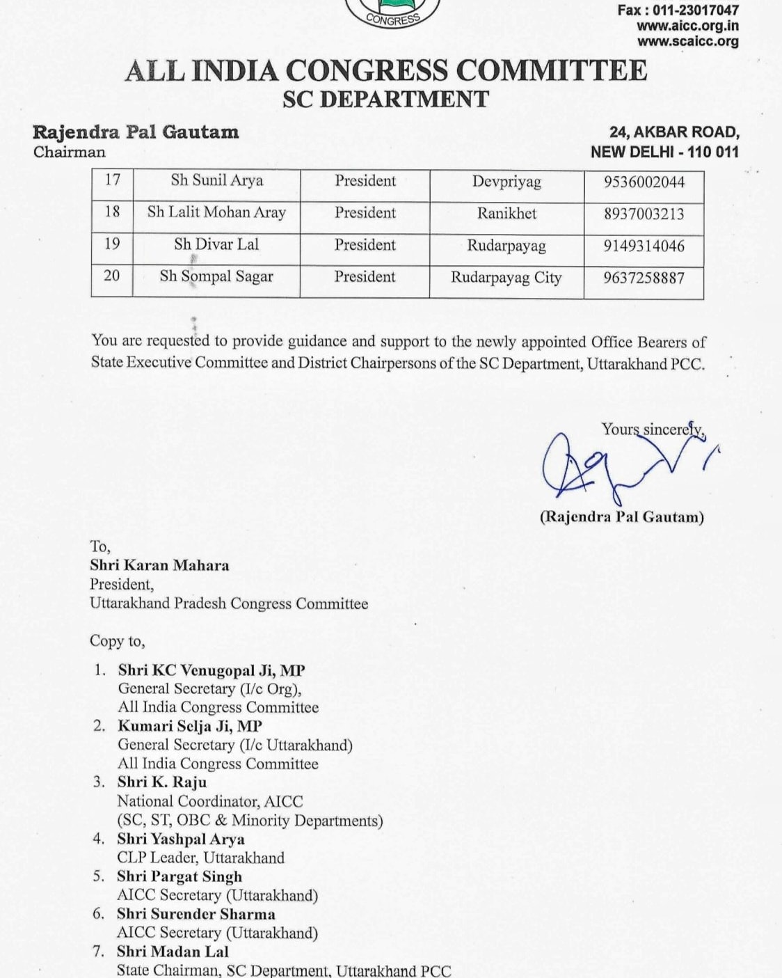 प्रदेश अध्यक्ष मदन लाल ने अखिल भारतीय कांग्रेसएससी विभाग के अध्यक्ष राजेन्द्र पाल गौतम, प्रदेश कांग्रेस कमेटी के अध्यक्ष करन माहरा, नेता प्रतिपक्ष यशपाल आर्या, पूर्व मुख्यमंत्री हरीश रावत, पूर्व अध्यक्ष प्रीतम सिंह, गणेश गोदियाल, उपनेता भुवन कापड़ी का धन्यवाद किया है। उन्होंने नवनियुक्त कार्यकारिणी के पदाधिकारियों को बधाई देते हुए अपेक्षा की है कि आज भाजपा द्वारा जिस तरह से समाज को बांटने का काम किया जा रहा है, हम सबने उनका मुकाबला कर कांग्रेस पार्टी को मजबूती प्रदान करने का काम करना है।