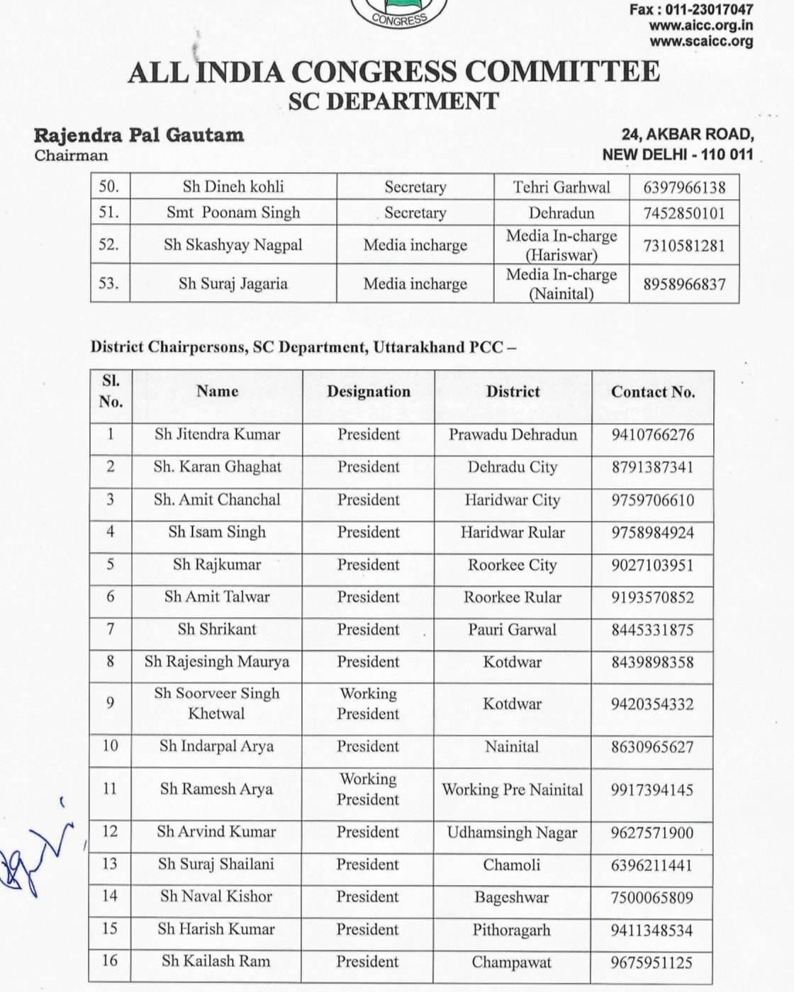 देहरादून। उत्तराखण्ड प्रदेश कांग्रेस अनुसूचित जाति विभाग के प्रदेश अध्यक्ष मदन की संस्तुति पर अखिल भारतीय कांग्रेस अनुसूचित जाति विभाग के अध्यक्ष राजेन्द्र पाल ने प्रदेश अनुसूचित जाति विभाग की कार्यकारिणी की नियुक्ति है।