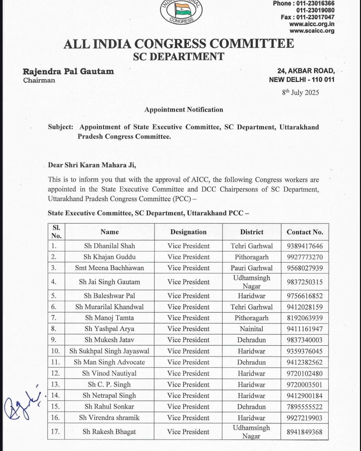 देहरादून। उत्तराखण्ड प्रदेश कांग्रेस अनुसूचित जाति विभाग के प्रदेश अध्यक्ष मदन की संस्तुति पर अखिल भारतीय कांग्रेस अनुसूचित जाति विभाग के अध्यक्ष राजेन्द्र पाल ने प्रदेश अनुसूचित जाति विभाग की कार्यकारिणी की नियुक्ति है।