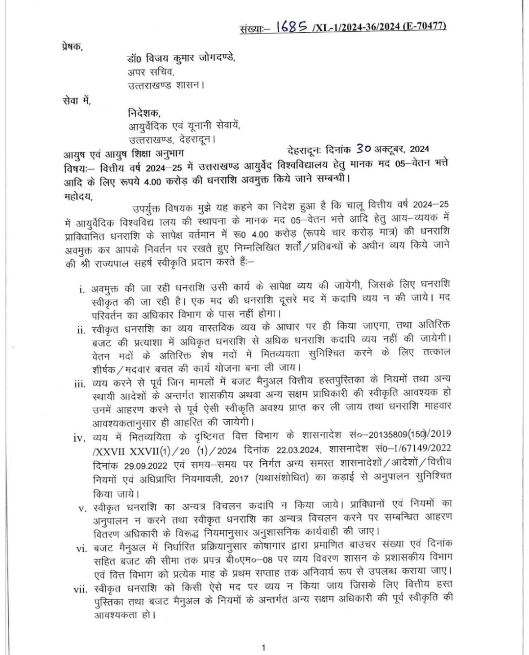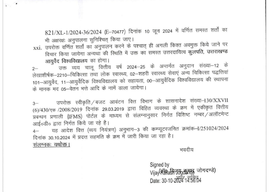 उत्तराखण्ड आयुर्वेद विश्वविद्यालय के कर्मचारियों के वेतन और भत्तों के लिए चार करोड़ जारी